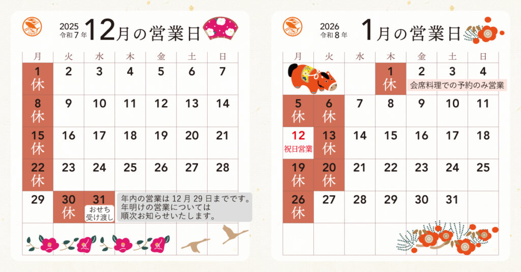 「家族で新年の食事をしたい」「新年会を少し早めにやりたい」そんな方はお早めにご予約ください。