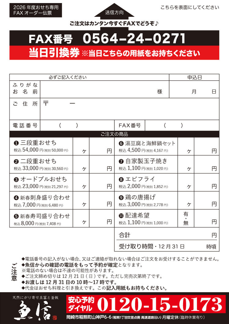笑顔あふれる新年のひとときに、岡崎・魚信のおせちをぜひお役立てください。