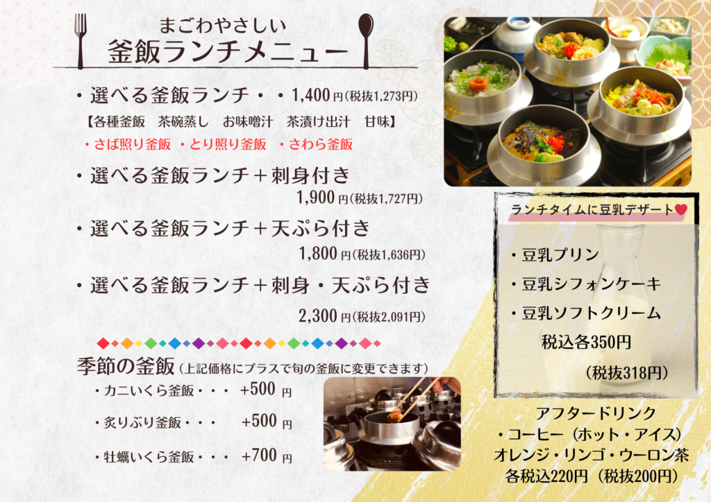 お昼にゆっくり楽しむならランチメニュー、特別な日には会席料理をどうぞ。