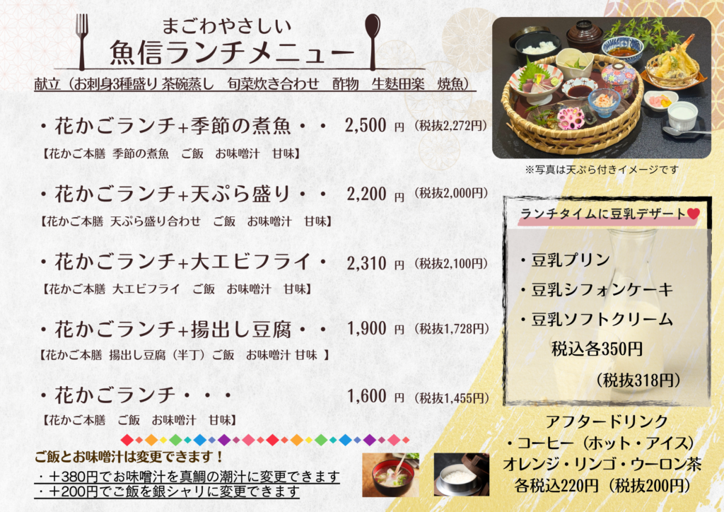 魚信では、旬魚を生かした定食・会席料理を通じて、四季の味をお届けしています。