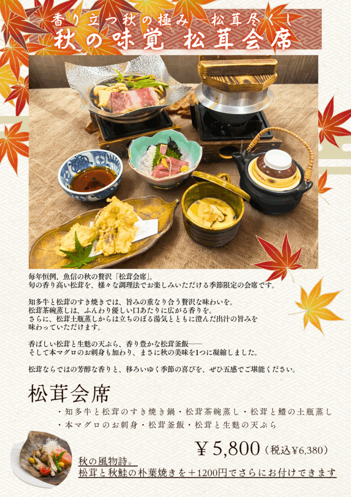 魚信の「松茸会席」は、この季節だけの特別な贅沢です。
