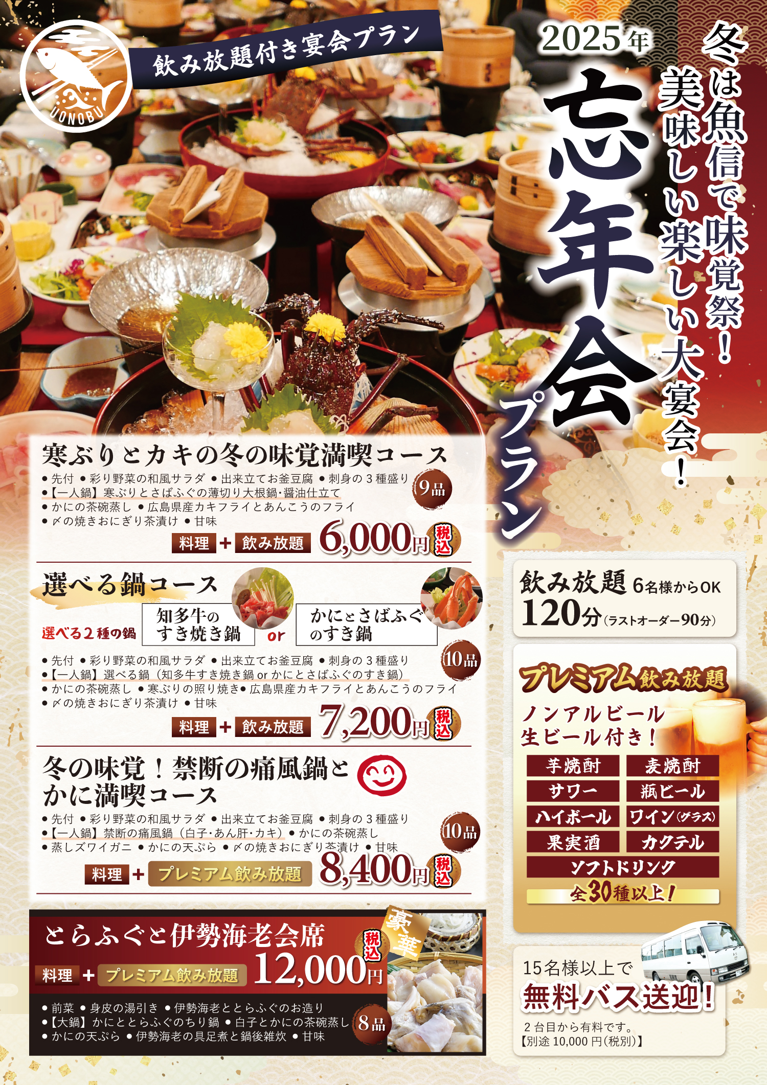 - 🍺 飲み放題付き会席(宴会メニューで)