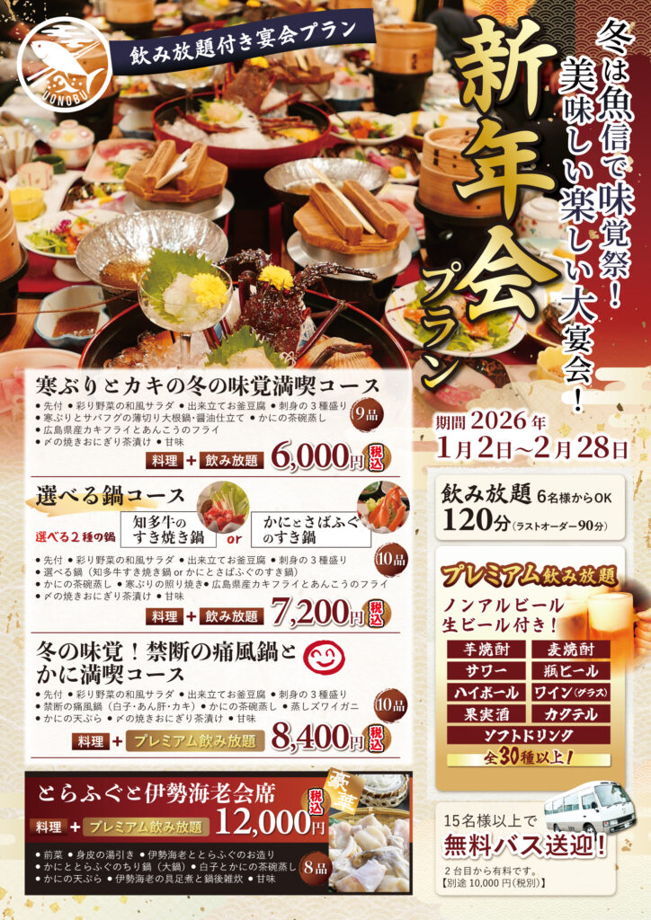 【岡崎市で宴会するなら魚信へ】飲み放題・バス送迎・個室完備!職場の集まりや家族宴会、忘年会・新年会・歓迎会・送別会におすすめ!