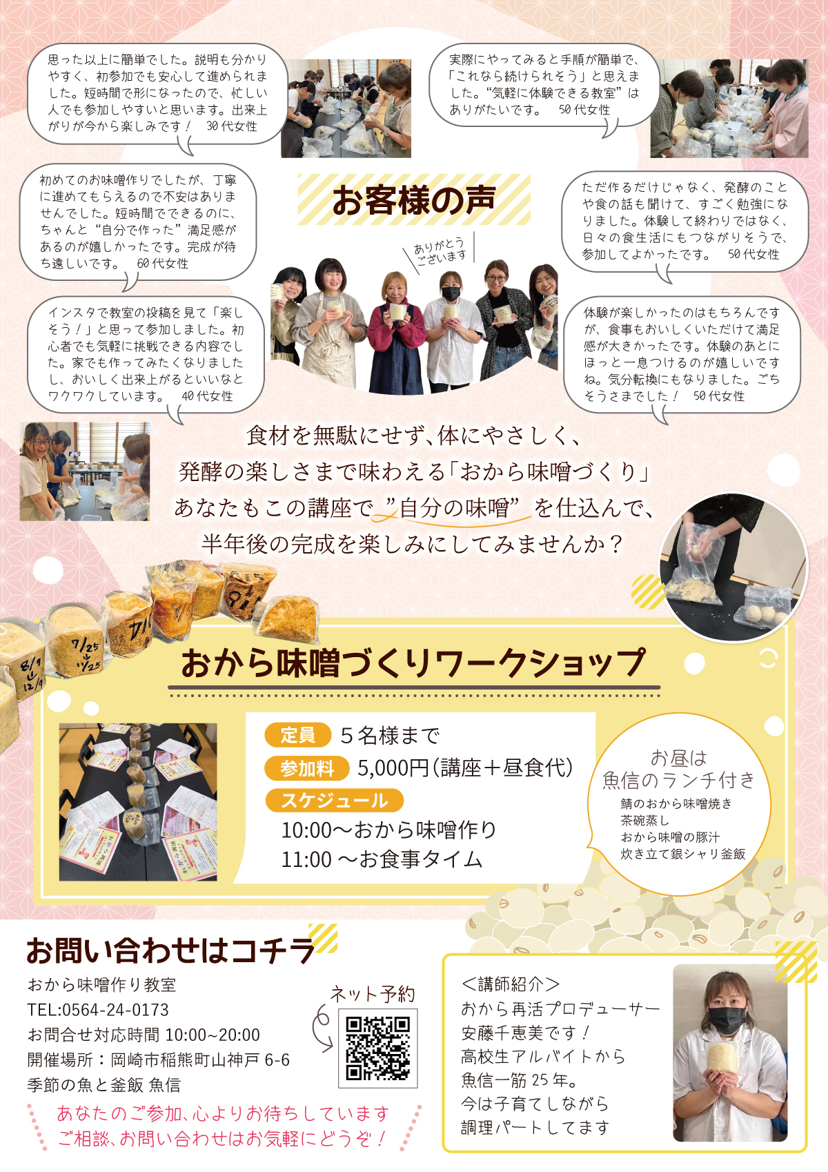 自分で仕込んだ味噌が、数ヶ月後に熟成されて完成した時の感動は、 言葉では表せないほどです。 その喜びと感動を、ぜひ一緒に体験しませんか? みなさまのご参加、心よりお待ちしております✨ 魚信スタッフ おから再活プロデューサー 安藤 千恵美
