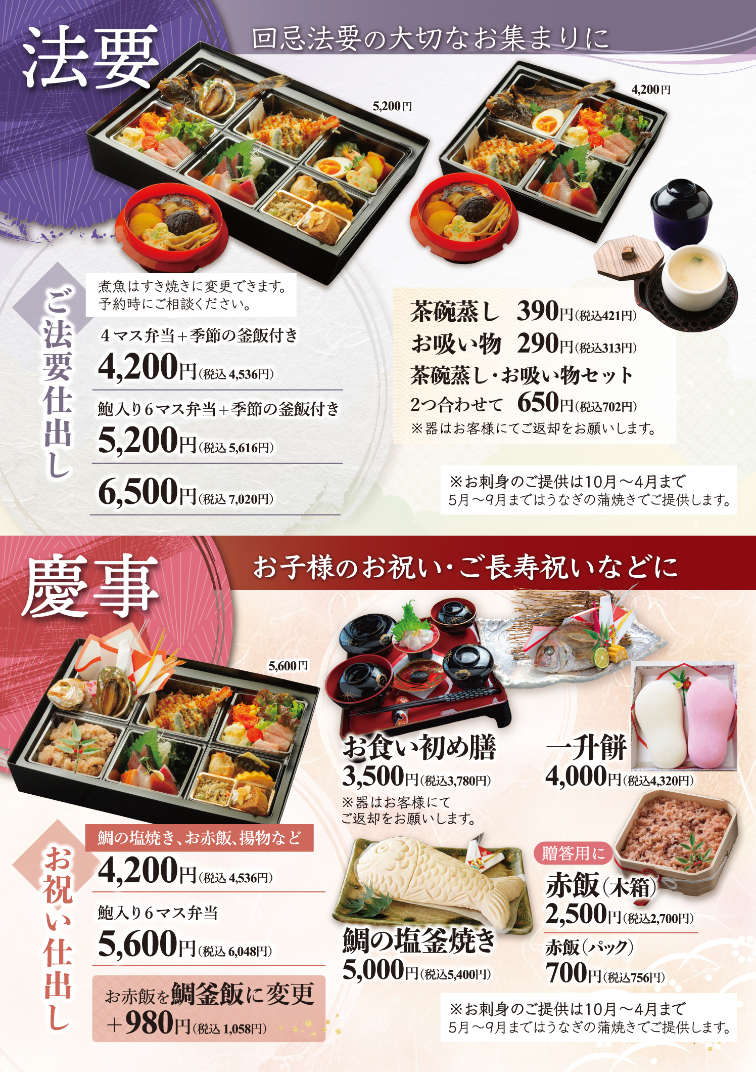 魚信の仕出し料理で、大切な方々と過ごすひとときを、より贅沢で豊かなものに。お電話でご予約お待ちしております。