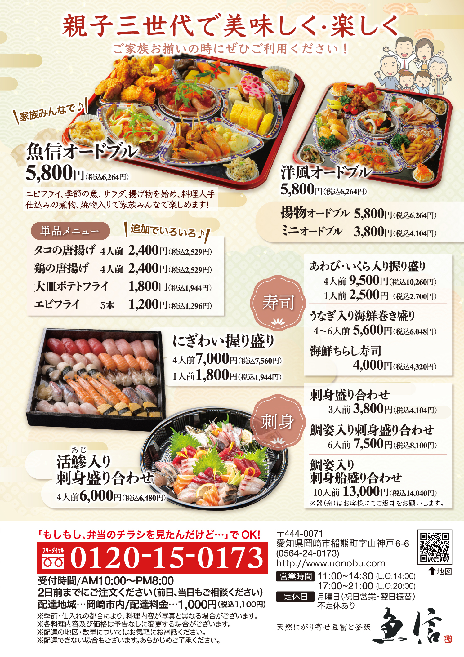 岡崎市で仕出し料理をお探しなら、創業57年の和食店「魚信」にお任せください。南伊勢や師崎から毎朝直送される新鮮な魚介類と、地元産の旬の野菜を使用し、職人が手間と時間をかけて作り上げた本格和食をご自宅にお届けします。