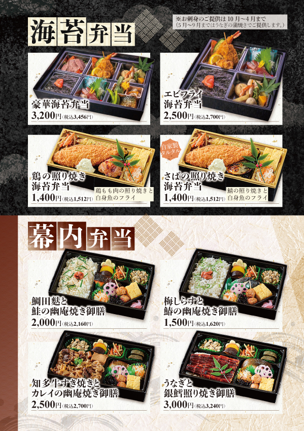 - 職人手作りの本格和食特別な日を彩る会席仕出しから、気軽なお弁当まで幅広いメニューをご用意しています。