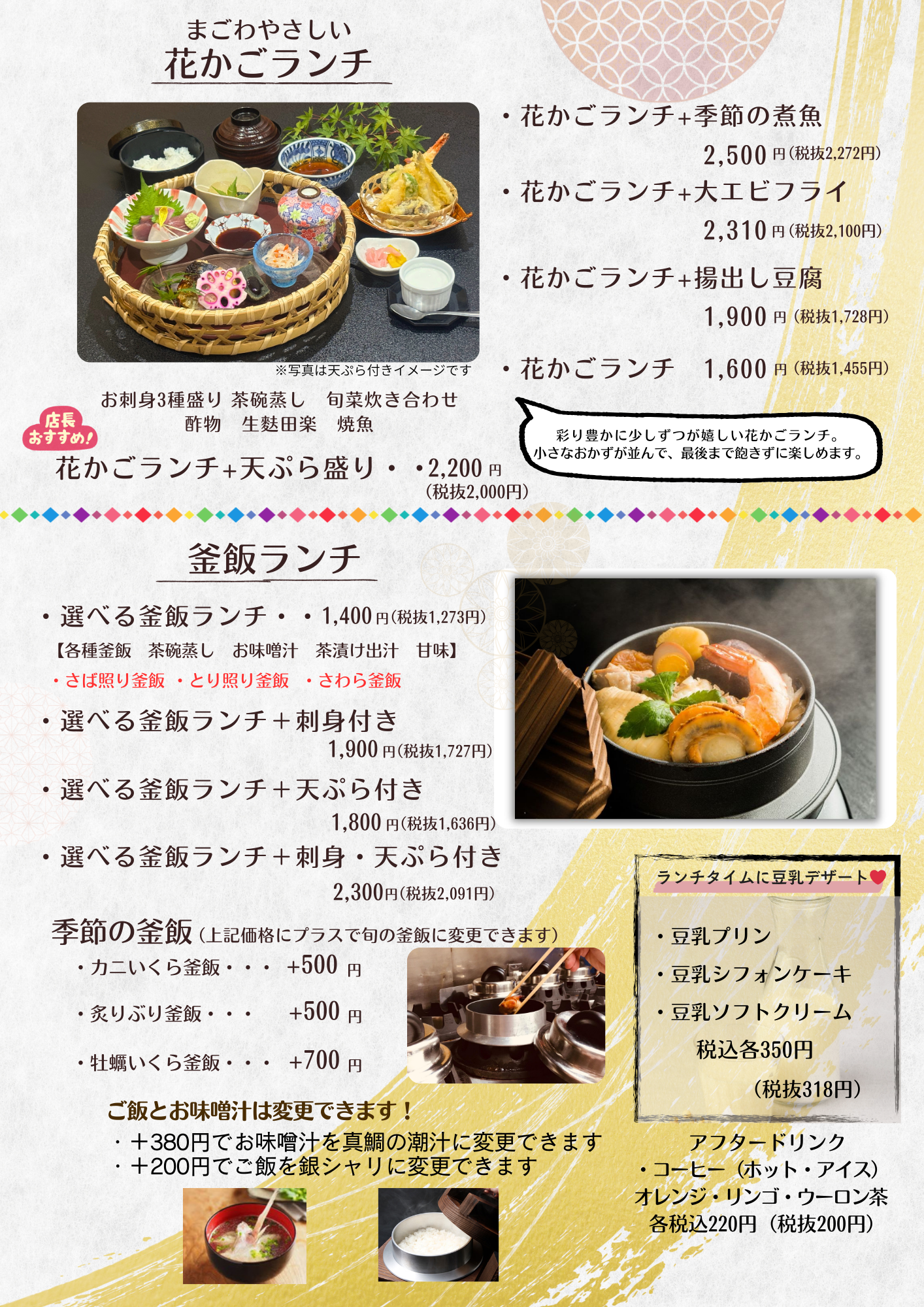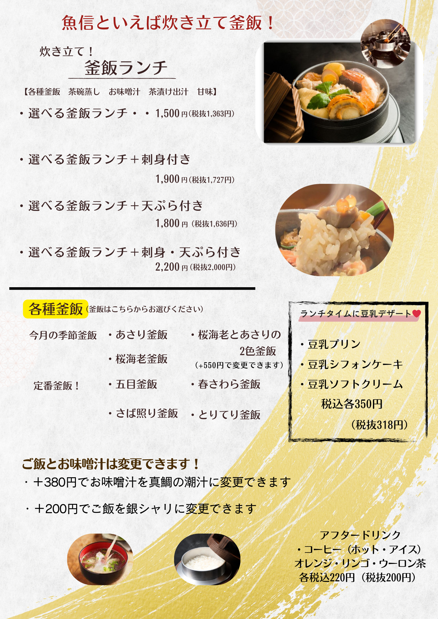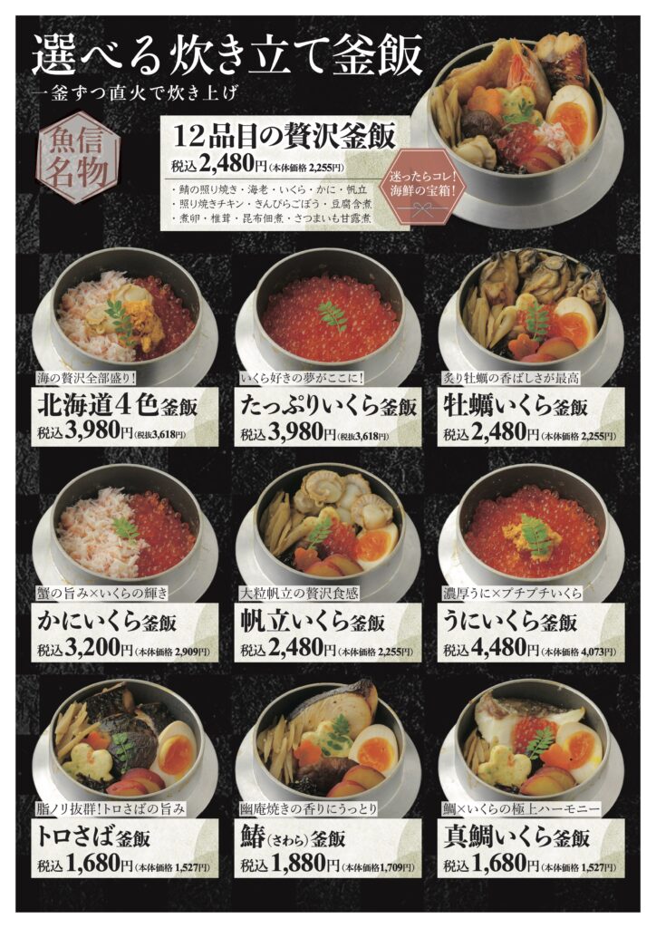 魚信は 「魚×豆腐×釜飯」 を中心に、免疫力を高め、健康を支援できる料理 を提供しています!